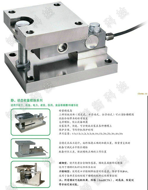 1.靜載稱重模塊:主要適用于側向力較小的靜載荷稱重場合。靜載稱重模塊可以非常方便地安裝在各種形狀的容器上。